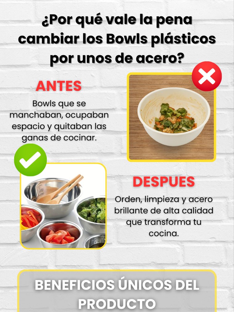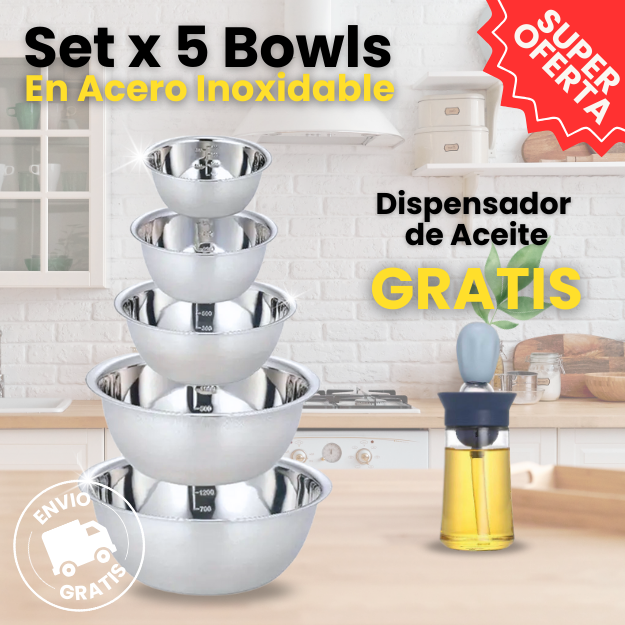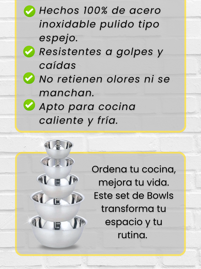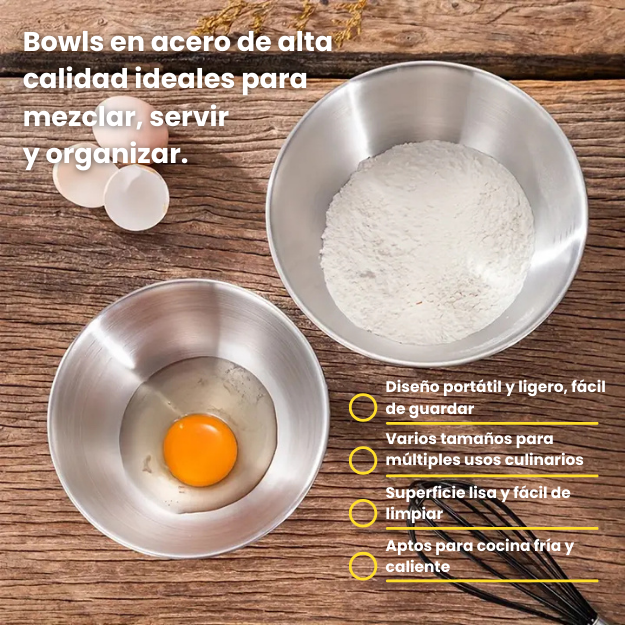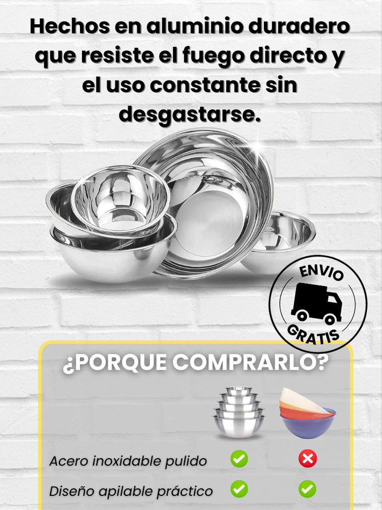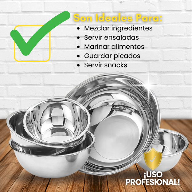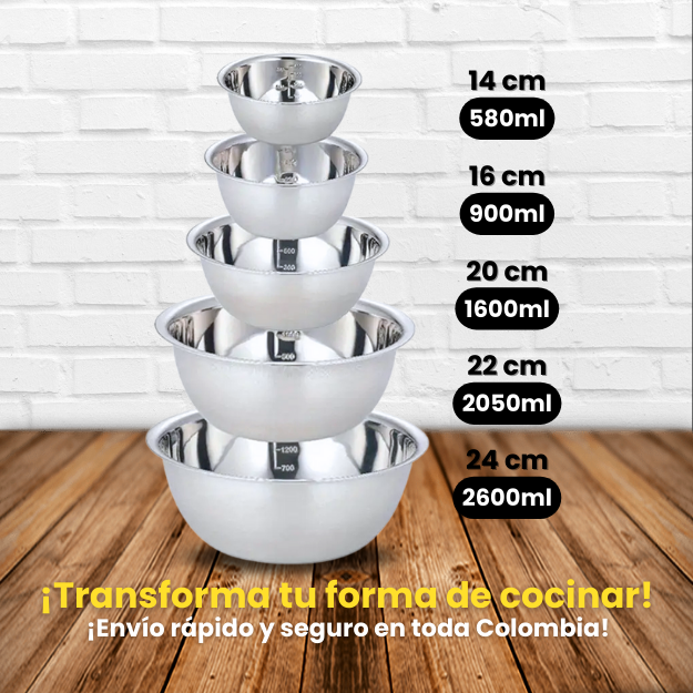 Incluye 5 bowls de acero inoxidable en diferentes tamaños, ideales para mezclar, servir, guardar o preparar todo tipo de alimentos.
