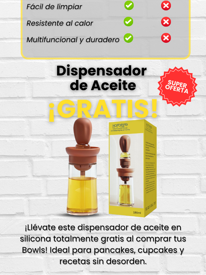 Es un dispensador de silicona ideal para pancakes, cupcakes o salsas. Te ayuda a verter con precisión y sin ensuciar. ¡Lo recibes totalmente gratis con tu compra de los bowls!